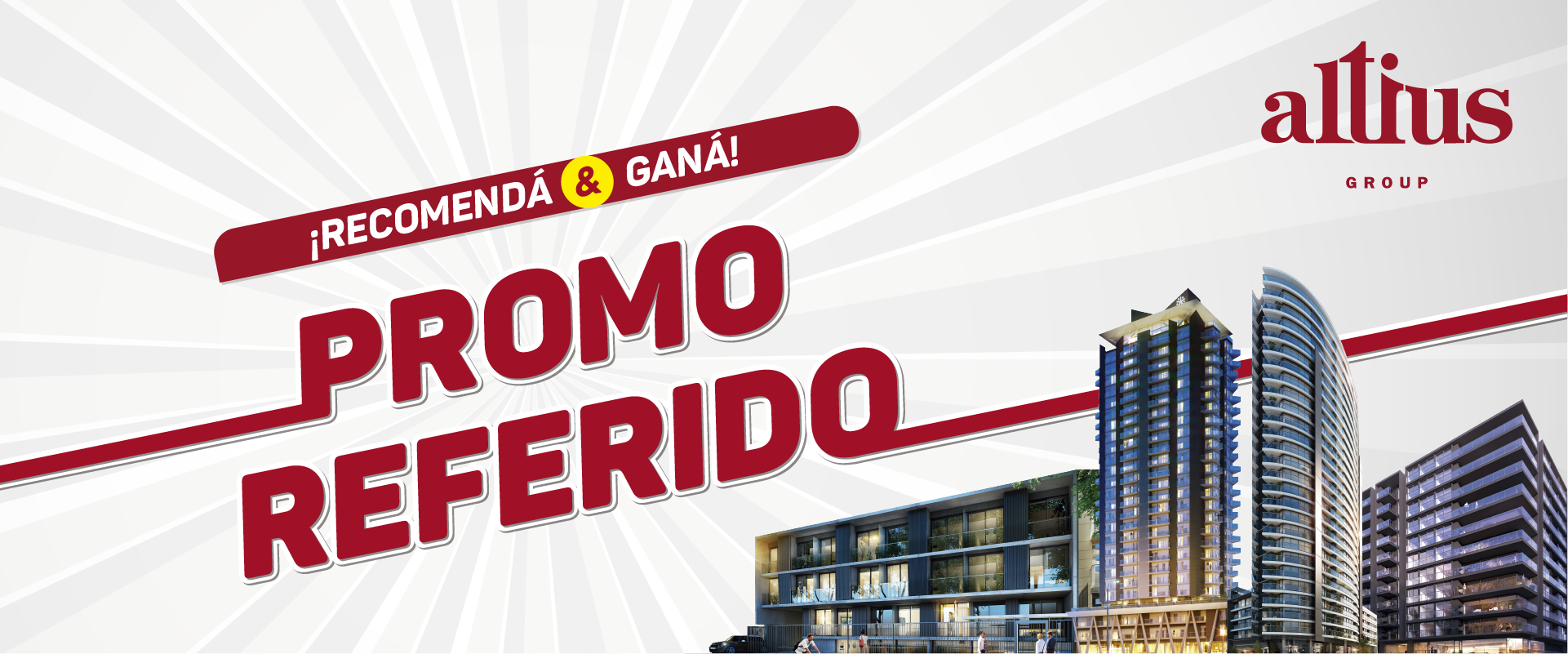 Si sos cliente comprador, recomendá Altius Group a un amigo que no pertenezca a nuestra base de clientes y si éste compra un apartamento te llevás de regalo un vale para compras de US$ 1000. Debés completar el formulario con tus datos y los datos de tu referido (nombre y apellido/e-mail/celular) previo a que éste se haya contactado con la empresa. El premio será entregado siempre y cuando se de algunas de las siguientes condiciones: a) el cliente referido haya integrado al menos el 20% del valor del apartamento. b) en caso de que el cliente referido precise préstamo bancario para la compra del apartamento, que el mismo se encuentre pre-aprobado por la institución bancaria y haya integrado al menos el 10% del valor del apartamento. Se entregará un solo vale por persona referida.
